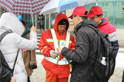 3月5日早上6点30分,迎着春寒,我校青年志愿者同学们在社团大楼门前集合,经过近2小时的车程到达长春市人民广场,与长春交通集团北达汽车公司志愿团队会合。与团队领导接洽后,明确了本次活动的任务及流程,随后组织志愿者们投身到志愿服务活动中。志愿者分三个小组开展活动,第一组成员在人民广场附近3个公交站点邀请市民朋友们对公交服务提出建议并留取信息,同时免费发放矿泉水;第二组成员向老人发放“公交爱心黄手环”,温暖痴呆老人回家路,点亮老人心中灯;第三组成员守候在公交失物招领处,请市民认领遗失在公交车上的证件、银行卡、钱包等贵重物品。公交站点人流较多,不时有询问的民众,同学们耐心讲解,用心服务。志愿者同学们干劲十足,在雨雪中奔波,受到了市民群众及北达公司志愿者们的称赞。