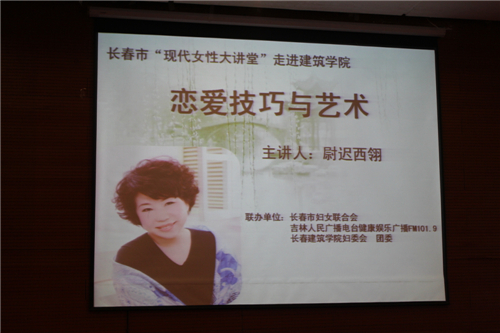 2016年3月15日,长春市“现代女性大讲堂”走进建筑学院“恋爱技巧与艺术”专题讲座在校土木学院报告厅举行。校妇委会、团委特邀吉林人民广播电台健康娱乐广播资深播音主持人、国家二级心理咨询师、中国心理学会会员、吉林省心理卫生协会理事、长春市心理卫生协会理事尉迟西翎担任主讲,与师生分享恋爱中的心理学。本次活动由长春市妇女联合会、吉林人民广播电台健康娱乐广播、学校妇委会、团委共同举办。学校各分院女辅导员、部分女教师及学校400余名学生参加了讲座。