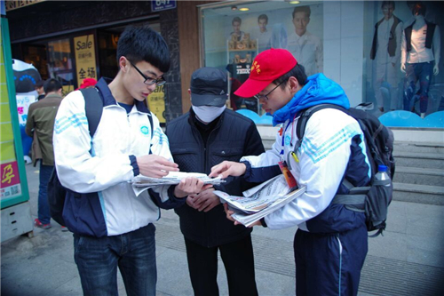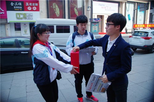 当日上午9时青年志愿者联合会的同学们统一着装,到达指定地点,他们带着小红帽,身穿校服,三四个人一组拿着募捐箱和报纸开始义卖。用义卖报纸的方式筹款,给路人带来了一份信任和安全,来往的社会人士很多都放下了戒备,奉献自己的爱心。尤为感动同学们的是:一位阿姨主动找到募捐同学捐出300元后,转身就消失在人群之中,默默地奉献了自己的一份爱心。还有一位乞讨的老奶奶,同学们给了她一元钱,但她看到同学们在募捐,她把钱退还给他们后又把自己乞讨来的钱也捐了出去;许多小朋友在父母的引导下亲手把钱放进募捐箱。有了这些爱心人士的鼓励,即使面对碰壁,同学们依然继续宣传、义卖。在同学们的努力和广大爱心人士的支持下,此次募捐总额达到8018.8元人民币。