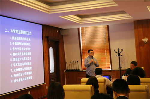 董事长首先从努力发现问题、切实解决问题、重立规矩规范三个方面阐述了十年回归学校关心的工作;从用房调整与排课优化、干部调整与重新聘任、多专业联合毕业设计、校内实践基地群建设、顶层设计与系统工作、学术交流与结对创新、纪检规范与作风重塑、两岸论坛与迎评促建、班子建设与结构调整九个方面和与会人员回顾了本学期主要抓的工作。接着就校内实践教学基地群的建设工作对全体参会人员进行动员。