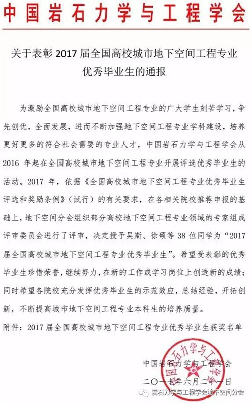 此奖项是城市地下空间工程专业高校毕业生的全国最高奖,得到了全国各高校的重视,这也是我校城市地下空间工程专业毕业生首次得该奖项,并有2名学生在众多竞争者中脱颖而出,同时获奖,这是对我院城市地下空间专业近年来学科建设快速发展、教学水平稳步提升、学生综合素质不断提高的又一次肯定和见证,充分展示了我校学子的风采,进一步提高了学院和学校在全国城市地下空间工程专业的声望。