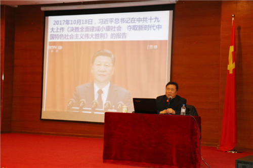 赵海月教授从新时代的新领袖、新时代的新方位、新思想的新内涵、新矛盾的新特点、新目标的新安排、新工程的新举措五个方面,解读了党的十九大精神,内容丰富、深入浅出、形象生动、幽默风趣,对学校师生深入学习领会党的十九大精神具有较大的启迪和指导作用。