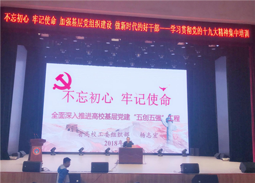 会上 ,省高校工委组织部部长、省教育厅高校干部处处长杨志宏作了题为《不忘初心 牢记使命 全面深入推进高校基层党建“五创五强”工程》的报告。杨部长主要从基层党建工作的内涵理解、新时代中央对基层党建工作提出的新要求、全面深入推进“五创五强”工程的主要任务三个方面进行了讲解,对我们进一步把握和领会新时期加强基层党建工作的精神内涵和实际意义,努力做好党建工作具有很大的指导作用。