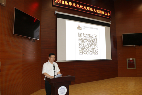 学生服务管理中心主任、校友联络处处长李琦发表了热情洋溢的讲话。他向志愿承担校友联络任务的毕业生们表示衷心的感谢,对受聘成为2018届校友联络大使的同学表示热烈的祝贺!他强调,母校是刻在每位毕业生身上的印记,校友联络大使是一份荣誉也是一份责任,每一位校友联络大使都要与所在班级同学保持密切联系,动态化地更新汇总班级校友信息库,更要广泛联络工作所在地其他学院、届别的校友,响应校友分会号召,积极参加校友活动,同时还要做好桥梁和纽带作用,汇总校友对母校的意见和建议并向校友通报母校发展近况。他希望每一位校友联络大使铭记母校的祝福与嘱托,充分利用网络新媒体等相关平台,将同学们联系起来,参与地方和学校校友会工作,与全国各地所有长建学子携手共助母校的发展。