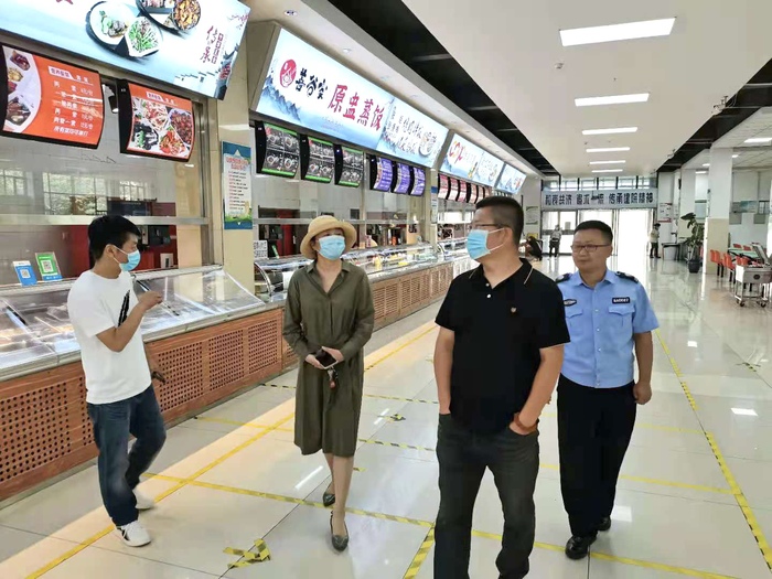 为认真贯彻落实省教育厅关于做好2021年秋季开学全省学校安全工作的通知要求,全力抓好学校疫情防控相关工作,有效防范、坚决遏制各类安全事故发生,切实保障师生健康安全,维护校园安全稳定, 8月27日下午,学校后勤处、保卫处、学生饮食服务中心组成联合检查组对校内的食堂、商业街、校医院等单位开展食品、消防、水电煤气等安全联合检查。学校校长助理兼后勤保卫服务管理中心主任薄磊、后勤处处长徐宏、保卫处处长曹大勇、学生饮食服务中心主任王卫英以及中心各职能处室工作人员参加了检查。