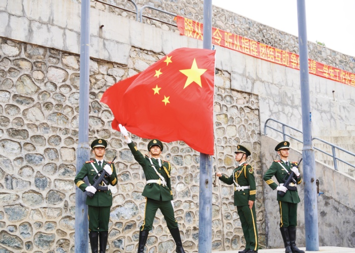 学校国旗护卫队护送国旗入场,全体人员面向冉冉升起的国旗,高唱国歌。