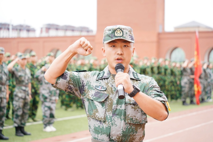 军训教官高梓强、罗羽红分别在奢岭、高新校区带领全体承训教官和参训学生宣誓。