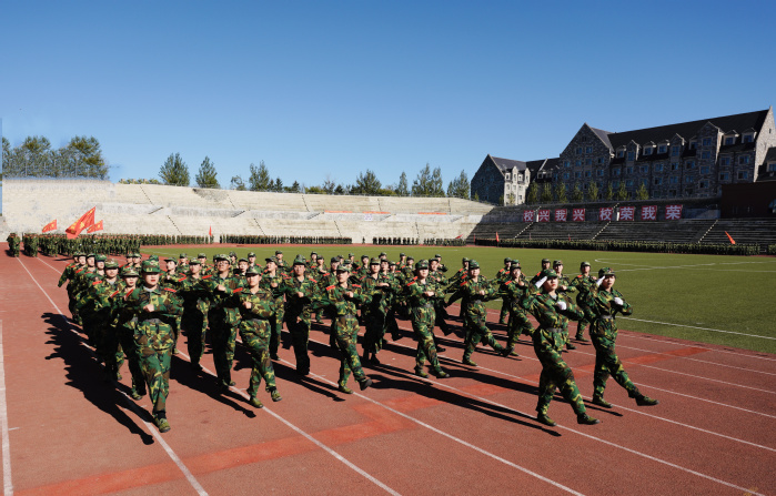 由800名新生组成的军体拳方阵表演,将信念与力量相结合,出拳刚劲有力,踢腿凌厉迅猛,一拳一式打出了军人的勇敢无畏与飒爽英姿,整齐划一的动作和高默契度的配合,充分展现出2021级新生澎湃的青春活力和昂扬向上的青春风貌。