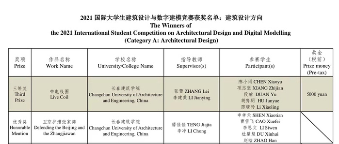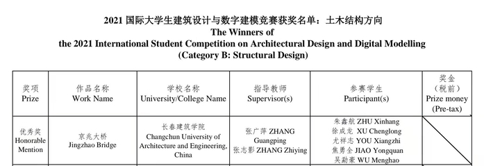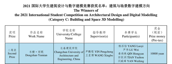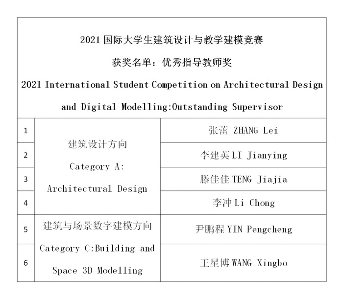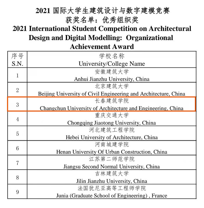 近日,2021国际大学生建筑设计与数字建模竞赛成绩公布,学校文化创意产业学院学生团队参赛作品《东栅.雨眠》荣获建筑与场景数字建模方向二等奖、建筑与规划学院学生团队参赛作品《带电线圈》荣获建筑设计方向三等奖、建筑与规划学院学生团队参赛作品《卫京护漕张家湾》荣获建筑设计方向优秀奖、土木工程学院学生团队参赛作品《京兆大桥》荣获土木结构方向优秀奖;指导教师张蕾、李建英、滕佳佳、李冲、尹鹏程、王星博荣获优秀指导教师奖;学校荣获优秀组织奖。