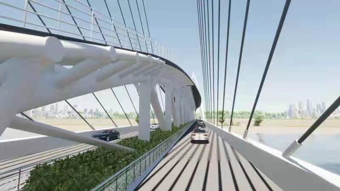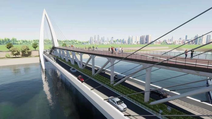获奖作品《京兆大桥》将选址定位于西安市,横跨灞河,直通西安奥体中心。采用新型的桥梁结构——双塔无背索斜拉桥,在桥梁上层人行道上设置了绘有“一带一路”所经过城市的观览台,人们就像走在“地图”上一样。它的出现注定会成为一个城市历史和记忆的凝结。