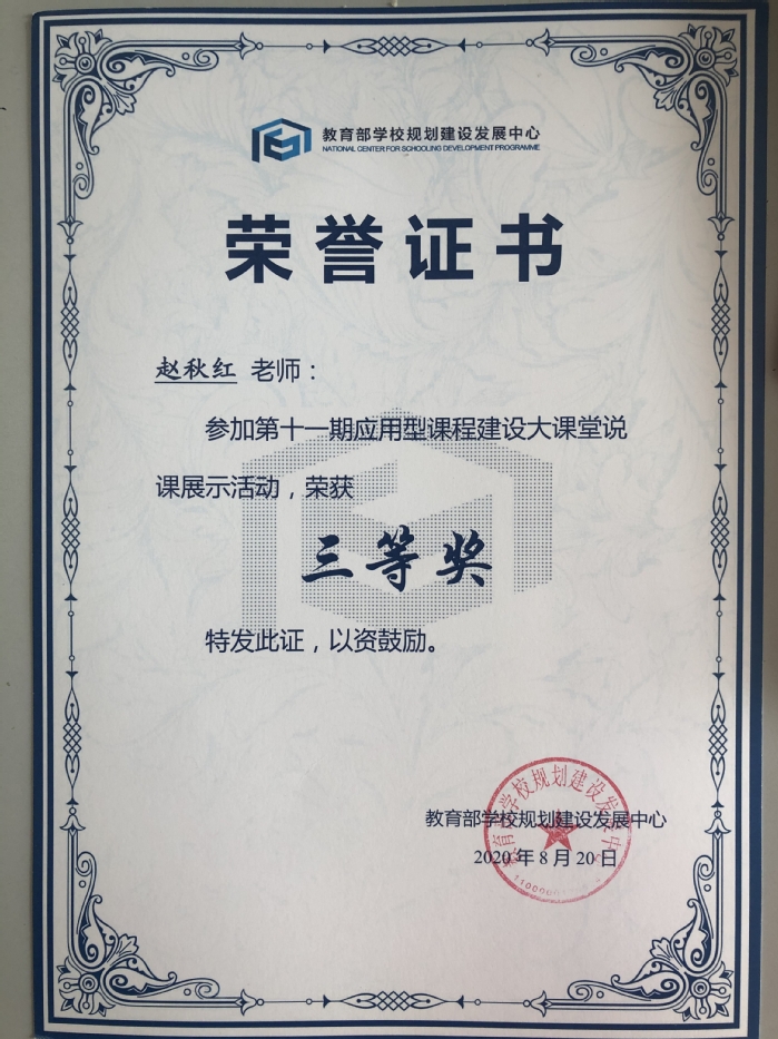 2020年,在教育部学校规划建设发展中心举办的第十一届应用型课程建设大课堂说课展示活动中,荣获得三等奖。