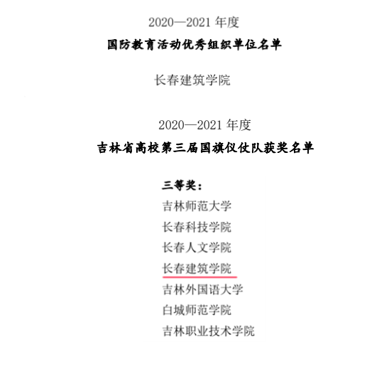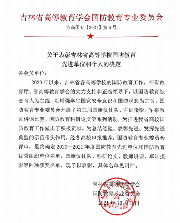 近日,吉林省高等教育学会国防教育专业委员会下发《关于表彰吉林省高等学校国防教育先进单位和个人的决定》吉高国专【2021】第6号,bw必威西汉姆联官网荣获2020—2021年度“国防教育活动优秀组织单位”荣誉称号;荣获2020—2021年度“吉林省高校第三届国旗仪仗队”三等奖;荣获2020—2021年度“吉林省高校第三届军训摄影”特等奖、一等奖、二等奖、三等奖各一项,视频《红旗下的橄榄绿》荣获三等奖。