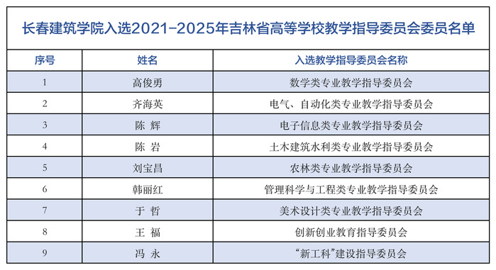 近日,吉林省教育厅发布了《关于成立2021-2025年吉林省高等学校教学指导委员会的通知》(吉教高〔2021〕27号),我校9名专家入选,分布在数学类、电气和自动化类、电子信息类、土木建筑水利类、农林类、管理科学与工程类、美术设计类等7个专业类教学指导委员会以及创新创业教育、“新工科”建设等2个专项工作类指导委员会。