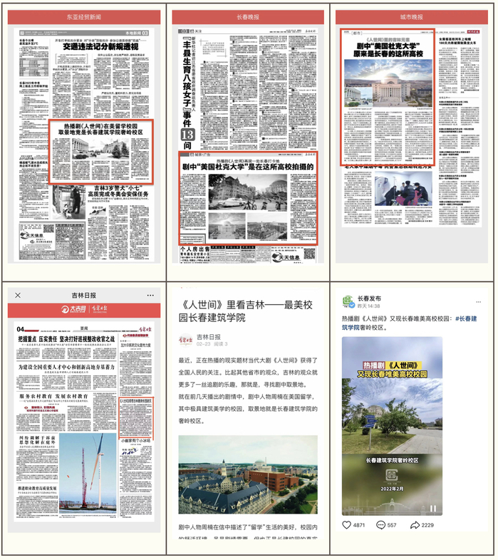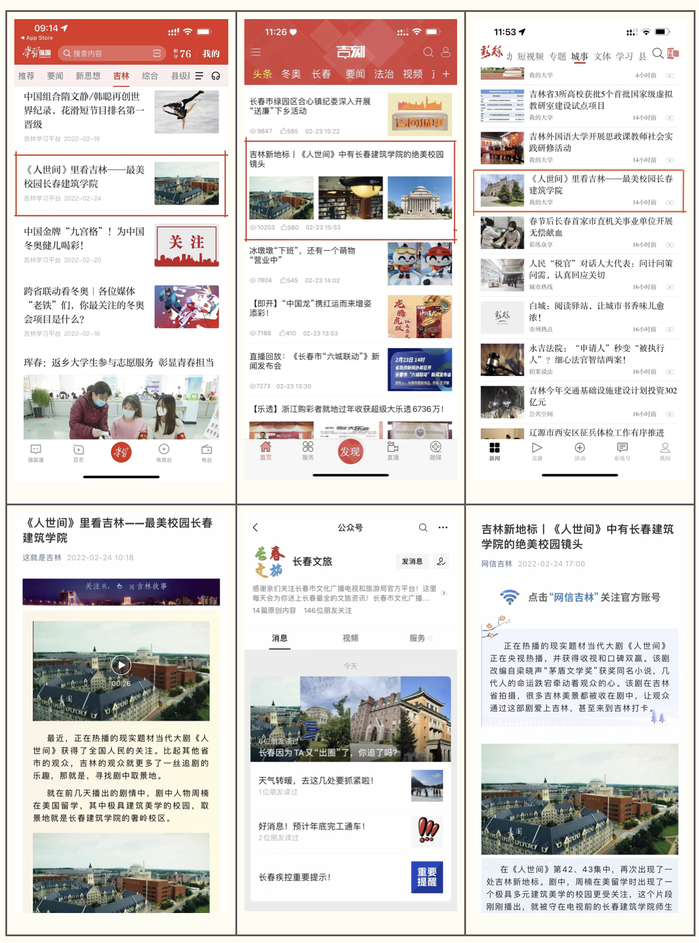 其中,吉林省委对外宣传办公室、省政府新闻办公室官方微信号推送;省文化和旅游信息中心、长春市文旅局、双阳区旅游局、双阳区经济开发区管委会官方微信号推送;省网信办、市网信办官方微信公众号推送;学习强国app首页推送;百度搜索首页推送;澎湃新闻、腾讯、网易、搜狐等媒体在网站进行全文转载;吉林电视台“守望都市”栏目组、长春电视台“城市速递”栏目组、吉林日报、城市晚报、长春日报、长春晚报、东亚经贸新闻等省市主流媒体采访报道......