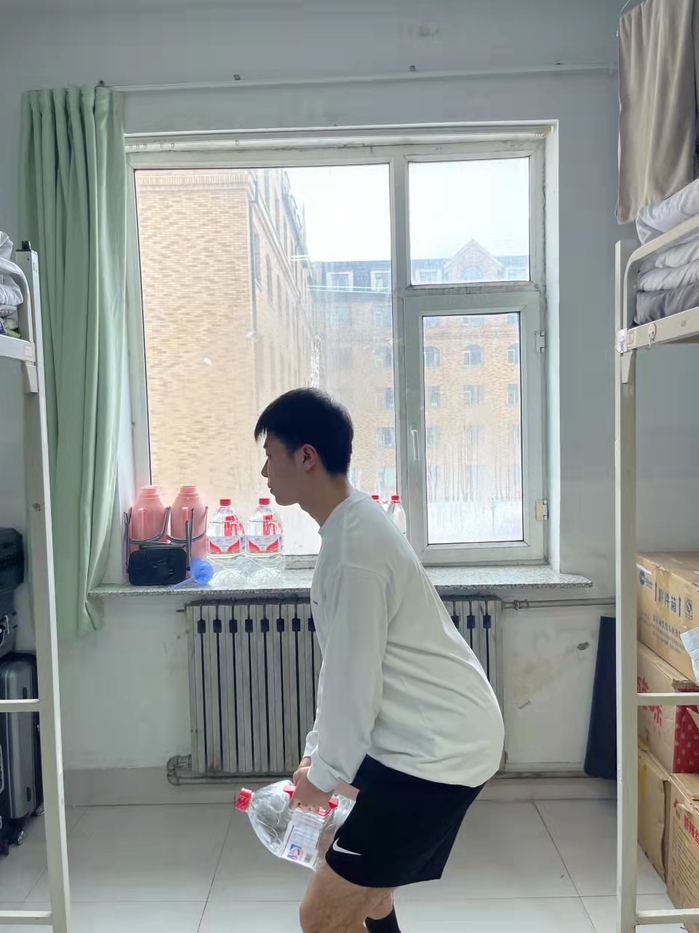 3. 负重深蹲:可以用身边物品作为负重,要领和深蹲相同。重点:下蹲到位,感觉腿部有酸胀感。难点:保持躯干挺直。