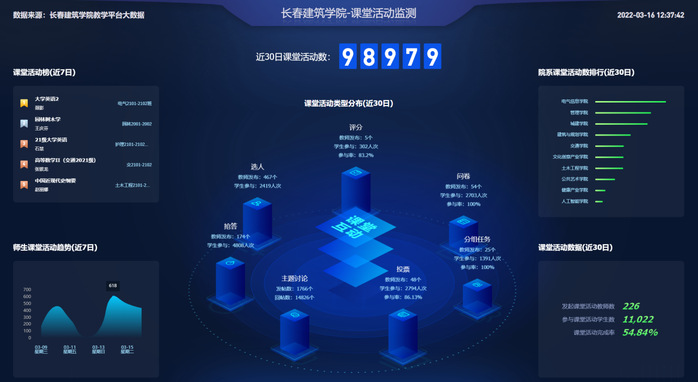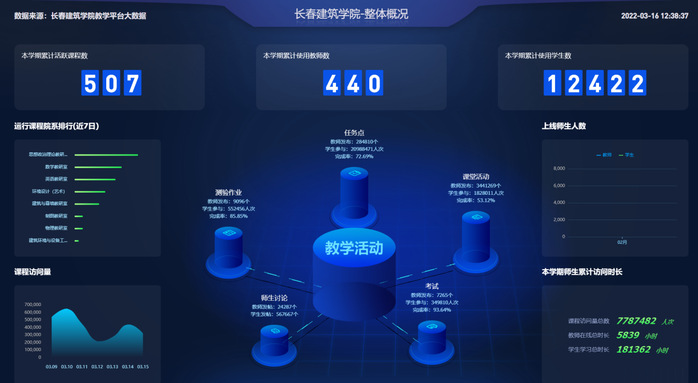 线上教学开展以来,学校累计在线巡课125门,督查学习通直播课堂83个、学习通腾讯会议课堂185个、同步直播课堂34个;学校督导听评课82门次,各教学单位教学管理人员和督导听评课 156门次;学生教学信息员反馈有效教学信息211条。通过“五位一体”的教学质量监控与评价,目前,学校线上教学管理规范、教学秩序良好,教师教学环节设计合理、课程内容丰富且较好融入课程思政、教学效果良好,学生到课率高、有良好的学习主动性和自觉性。