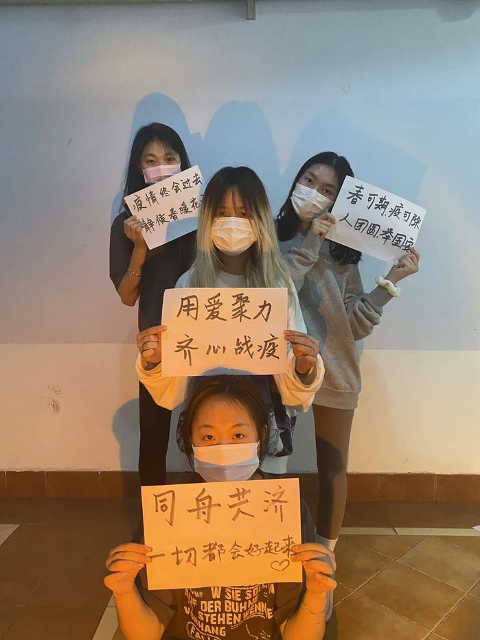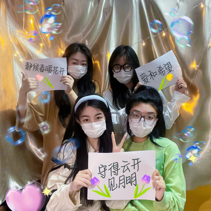 我们来自304寝室。疫情之下,我们每一个人都在与新型冠状病毒进行严峻的斗争。每天都处在封闭管控内的我们每时每刻都期盼着疫情快快结束。我们期待着盼望着在疫情结束后,娜娜请我们去吃火锅,娜娜带我们去吃蛋糕,娜娜带我们去吃海底捞!希望所有同学,静候春暖花开。到那时,我们相约美丽校园。