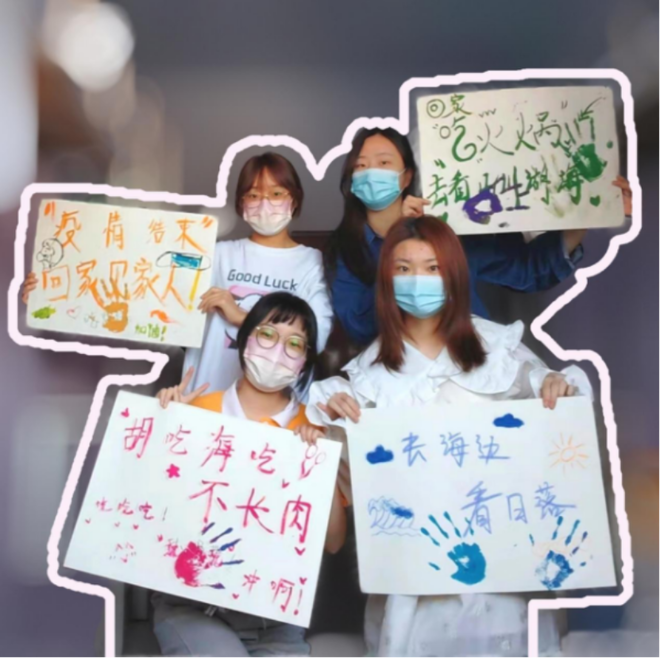 我们来自H栋女寝427。那就等疫情结束后我们见一见吧,在春天,在吉林,在长春,吹吹净月潭的晚风,走走桂林路,逛逛南湖公园。去见想见的人,去做想做的事。一起去旅游、一起听演唱会、一起吃火锅、一起享受生活吧!看世界 看浪漫 找自己!“吉林终有吉临时,长春定复往常春”疫情终会过去,静候春暖花开。疫尘不染,静候疫散。