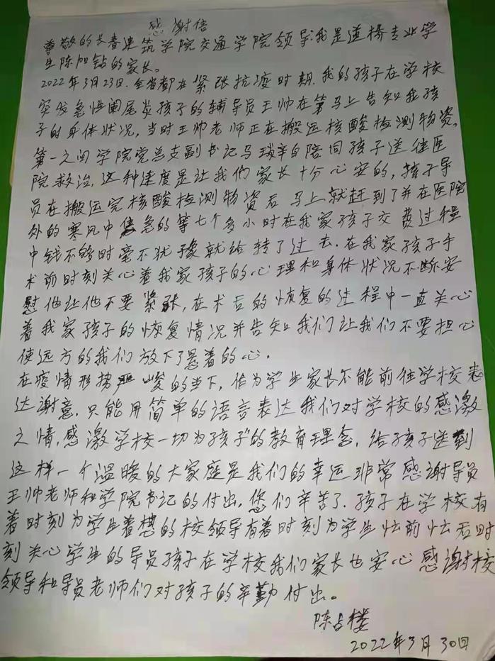 “感激学校‘一切为孩子’的教育理念,给孩子送到这样一个温暖的大家庭是我们的幸运。”3月30日,这名学生的家长将自己的手写信拍下照片发给了学校,在信中他表达自己的感激时,如此说道。“孩子在学校有时刻为学生着想的校领导,有时刻为学生忙前忙后的导员,孩子在学校,我们家长也安心。感谢校领导和导员老师对孩子的辛勤付出。”