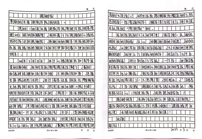 3月22日,另一位学生因耳前瘘感染严重必须入院治疗,高铭彤虽然未能在医院陪同,但从学生住院到出院那段时间,高铭彤每天都通过电话和微信关心学生病情、及时疏导学生心理保持乐观心态,并及时向家长反馈学生情况。通过专业治疗,学生病情好转,出院后写下了一封信以表对高铭彤的感谢。