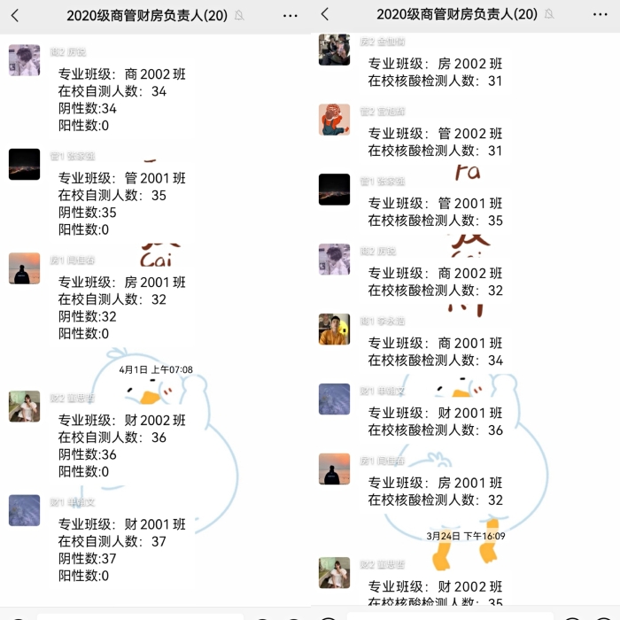 在校学生的人数统计、组织学生有序核酸检测、每天早7点半群内上报核酸抗原自测结果统计、封控条件下对隔离学生的关怀关爱以及对全体在校学生的思想引领和心理疏导成为了高铭彤近期的工作重点。