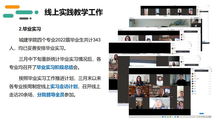 4月8日,城建学院副院长刘丽莘作题为《经验分享 相互学习 持续改进 重在实效》的主题分享,她从领导责任、线上督导、实践教学三个方面分享了城建学院如何充分发挥分院领导班子和分院督导组的作用,保证线上教学质量。3月8日转为线上教学以来,城建学院领导高度重视、统筹推进、周密组织,调派专家组建督导组,制定线上教学督导听课任务,实现学院领导听课全覆盖。建立周例会制,督导组定期汇总问题,并指导整改,取得了良好的成效。3月中旬,学院召开毕业实习阶段总结会,总结毕业实习工作,并组织各专业进行线上走访。学院领导班子成员全员参加每一场线上走访,与学生交流实习情况,与企业导师进行座谈,了解行业需要及人才培养需求。