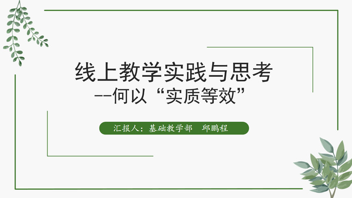 4月13日,基础教学部副主任邱鹏程作题为《线上教学实践与思考》的主题分享。基础教学部结合线上教学工作实践,坚持以学生为中心,在不改变教学目标的前提下,重新对公共课进行整体教学设计。要求授课教师从课前启发式引导、课中同频共振、课后激发学生主观能动性和课余指导学生自主探究等环节进行过程性管理,并进行阶段性考核评价。深化了线上课堂管理,实现了线上与线下教学质量“实质等效”。