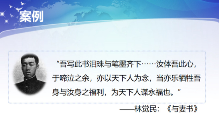 1. 案例法:在讲授资产阶级革命派骨干力量的知识分子时,以“铁血丈夫”林觉民为例,讲述他在起义前写的绝笔《与妻书》,表达了热血男儿舍身家国的英雄气概。