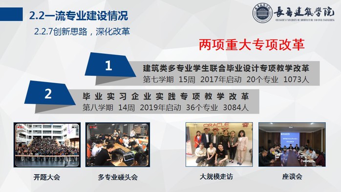 会议第二项,长春工业大学人文信息学院专家组就我校被查一流专业建设情况与相关专业负责人进行了交流研讨。长春工业大学人文信息学院建设工程学院院长孙娜、艺术设计学院院长王明时、建设工程学院教研室主任王玉军、信息工程学院院长吴琼等在充分肯定我校一流专业建设取得的成绩的基础上,从优化师资队伍结构、挖掘专业特色优势、深化教育教学改革等方面提出了意见和建议,相关一流专业建设点负责人分别就专家提出的问题给予解答,并展开深入讨论。