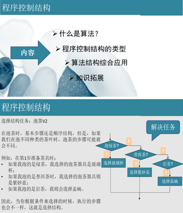 在知识点讲解过程中,采用我国传统技术—泡茶作为引例,引出《C语言程序设计》这门课程中的三大结构,进而提出三次重构案例的算法结构,层层递进,让学生充分掌握程序设计中算法结构综合应用方法。