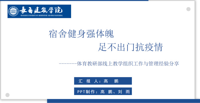 4月27日,体育教研部副主任高鹏作题为《宿舍健身强体魄,足不出门抗疫情》的主题分享,他从教学运行、教学特色、教学督导、教师能力提高四个方面介绍了体育教研部的具体做法。体育教研部通过学习文件、集体研讨、省内调研、专家访谈等前期准备工作,制定了以“灵活思变、不拘一格、课程思政、100%运动率”为指导方针的线上体育课程教学方案。教师积极开发适合宿舍狭窄空间运动的课程资源,录制多元化教学视频,利用多种教学方式方法,构建“课内外一体化”公共体育教学模式,实现了学生课内100%运动率和课外坚持科学体育锻炼的教学根本任务。