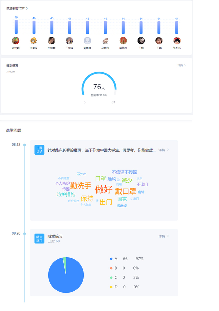 通过开展近期的线上教学,学生可以利用学习通进行预习,课上授课互动氛围有所提升,提高了学生的听课效率,学生能够紧跟老师思路,积极抢答,整体学习效果良好。