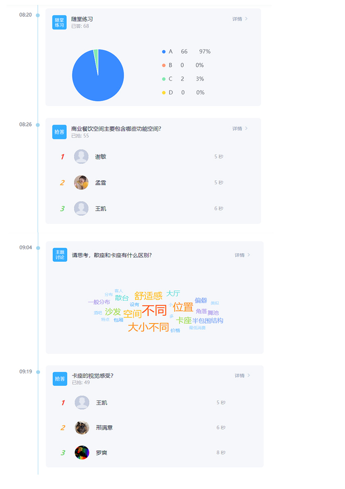 在这一阶段教师主要采取的是非正式评价,在整个教学过程随机进行。也是课程教学的互动环节,主要通过学习通推送主题讨论、随机选人、随堂练习、课后作业几个部分进行。主要目的是确保学生活动的方向并鼓励学生对研究过程进行反思,有助于学生认知自己对探究活动付出的努力程度。