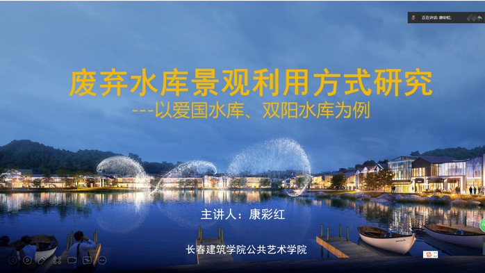5月18日,学院公共艺术学院艺术与科技教研室主办了题为“废弃水库景观利用方式研究---以爱国水库、双阳水库为例”的线上学术讲座,邀请了长春长规城市建筑设计有限公司景观与规划部部长康彩红担任主讲,学院公共艺术专业、艺术与科技专业和环境设计专业师生共计800余人参加了此次线上讲座。