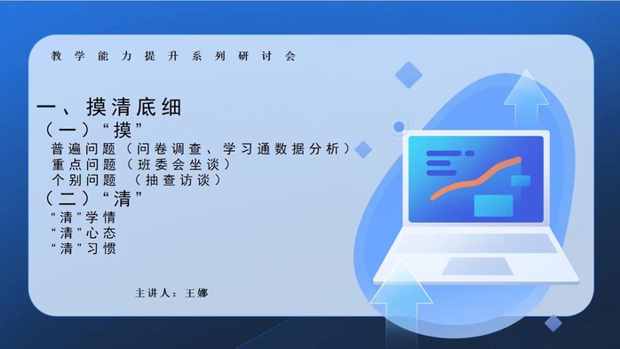 本次研讨会的第一个发言人为工商管理教研室主任王娜老师,她分享了关于疫情后线上与线下教学有效衔接路径的思考,分析了摸清底细-解决问题-查缺补漏路径的实施要点。具体举措为问卷调查、学习通数据分析-“摸”普遍问题-集中突破;班委会坐谈-“摸”重点问题-聚焦打破;抽查访谈-“摸”个别问题-逐一突破,为发现所有问题,还需要“清”学情、“清”心态,“清”习惯,针对具体问题实施具体“清”的办法,为实现全面、全方位解决问题,还需查缺补漏-课前巡查、课中观察、课后抽查。
