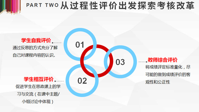 赵丽娜老师在发言中总结探讨了学生思政课成绩考核方法改革问题。她讲到,应着重过程性评价、关注学生学习的全过程,关注学生成长和发展,关注学生主体性的发挥,关注学生课堂参与度。教学过程性评价是对教师教学实践活动的反馈,也是衡量学生学习效果的重要参考因素。考核方式改革的目的是把立德树人的理念落实到实处。考核方式的改革并非一蹴而就,需要教师和学生的共同努力。作为教师应从多个方面、多个角度考察学生对学习掌握情况,公平公正地对待每位学生。现在看来,思政部的考核方法改革思路,恰好符合学校学生考核方式方法改革的大思路。