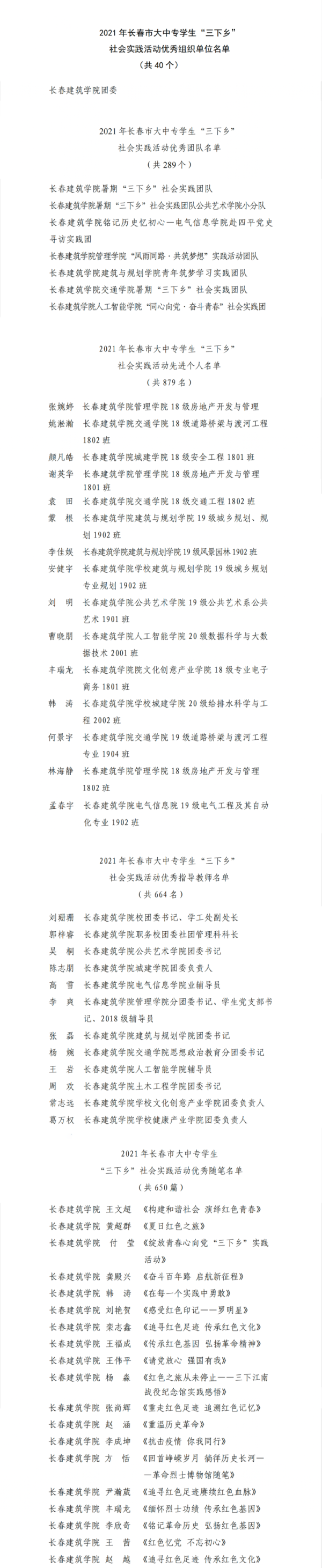 学校团委荣获“优秀组织单位”称号;校团委学生会、公共艺术学院、电气信息学院、管理学院、建筑与规划学院、交通学院、人工智能产业学院荣获暑期“三下乡”社会实践团队“优秀团队”称号;张婉婷等15名学生荣获暑期“三下乡”社会实践活动“先进个人”称号;校团委书记、学生工作处副处长刘珊珊等12名教师荣获“优秀指导教师”称号;王文超等同学的20篇随笔荣获“优秀随笔”称号。