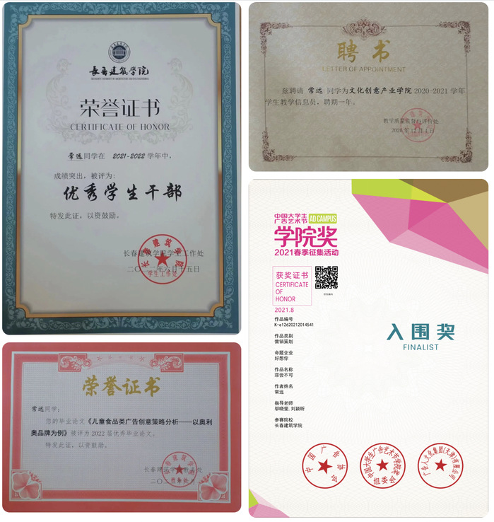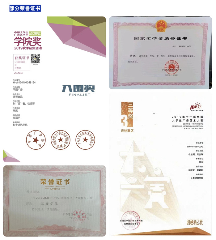 2020年5月荣获全国大学生广告艺术大赛吉林赛区三等奖;