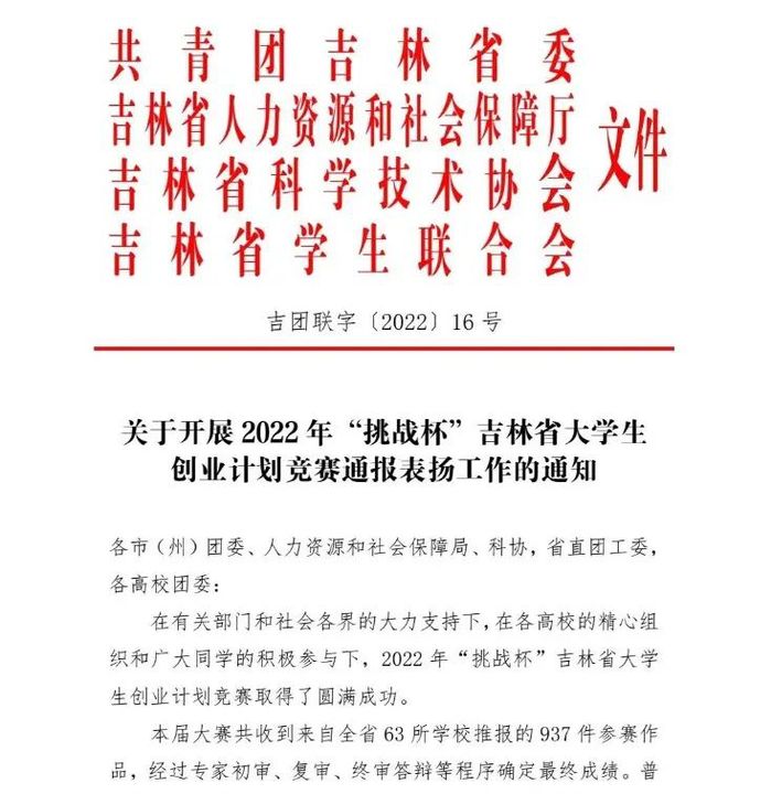 近日,共青团吉林省委、吉林省人力资源和社会保障厅、吉林省科学技术协会、吉林省学生联合会联合下发《关于开展2022年“挑战杯”吉林省大学生创业计划竞赛通报表扬工作的通知》,学校参赛的20件作品,有14项获奖。其中,获一等奖1项、二等奖4项、三等奖9项,1名指导教师获评优秀指导教师,学校获评“优秀组织单位”。
