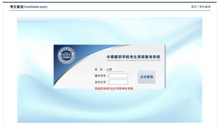 3.进入相应省份考生查询页面,输入考号、身份证号即可查询,查询时间为每日10:00——18:00。如出现“目前还没有'2022'年的考生信息”字样,请等待该省份录取完毕再进行查询。