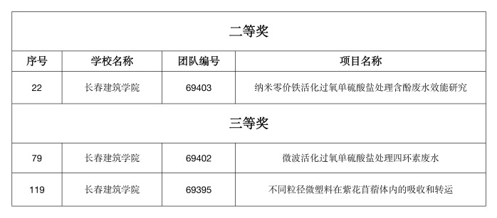 本次竞赛共有来自全省26所高校的519支队伍报名参赛,经网络评审,106支参赛团队入围决赛。学校城建学院给排水科学与工程教研室高度重视、积极备战,在专业学科带头人宋铁红教授的指导下,由教研室主任魏宏艳带队,组成4支队伍参加科学探究类赛道比赛。经过激烈角逐,参赛项目《纳米零价铁活化过氧单硫酸盐处理含酚废水效能研究》(指导老师:刘泓序、刘莹)荣获二等奖,《微波活化过氧单硫酸盐处理四环素废水》(指导老师:李姝杰、赵昱)、《不同粒径微塑料在紫花苜蓿体内的吸收和转运》(指导教师:魏宏艳、陈丽珠)荣获三等奖。
