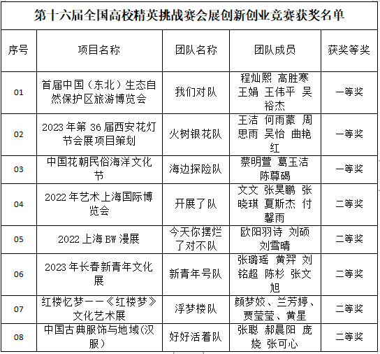 全国高校商业精英挑战赛会展专业创新创业实践竞赛是我国会展教育领域中,院校覆盖全面、校企合作深入、国际交流广泛的赛事活动,形成了集学科竞赛、产学合作与国际交流三位一体的创新实践平台,并已纳入学科竞赛排行榜。学校师生通过参赛,增进了与会展业界和兄弟院校间的交流,展示了良好的精神风貌和精湛的专业技能,提升了学生专业实践创新能力。