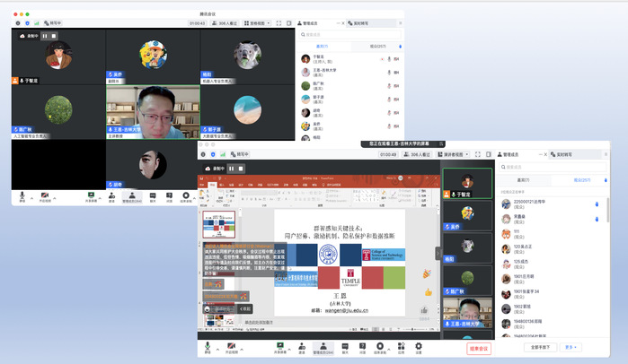 王恩教授现为吉林大学计算机科学与技术学院博士研究生导师,吉林省拔尖创新人才、入选省青年人才托举计划。他在讨论到移动群智感知在发展中面临的问题时着重介绍说,移动群智感知能够提供数据与服务的基础是移动用户,其在移动性、感知能力、招募场景、到来顺序等多个方面有着个性化的复杂特性。而面对如上特性,在实际应用中,应该如何选择适合的用户来完成感知任务,仍是亟待解决的关键问题。为此他从用户招募策略、激励机制、隐私保护策略、数据推断方法等方面逐一提出问题并予以剖析。针对自己团队近期研究成果,同时结合实验结果,向老师和同学们深入讲解了对于各类策略、机制等方面的具体实现方式和创新之处。
