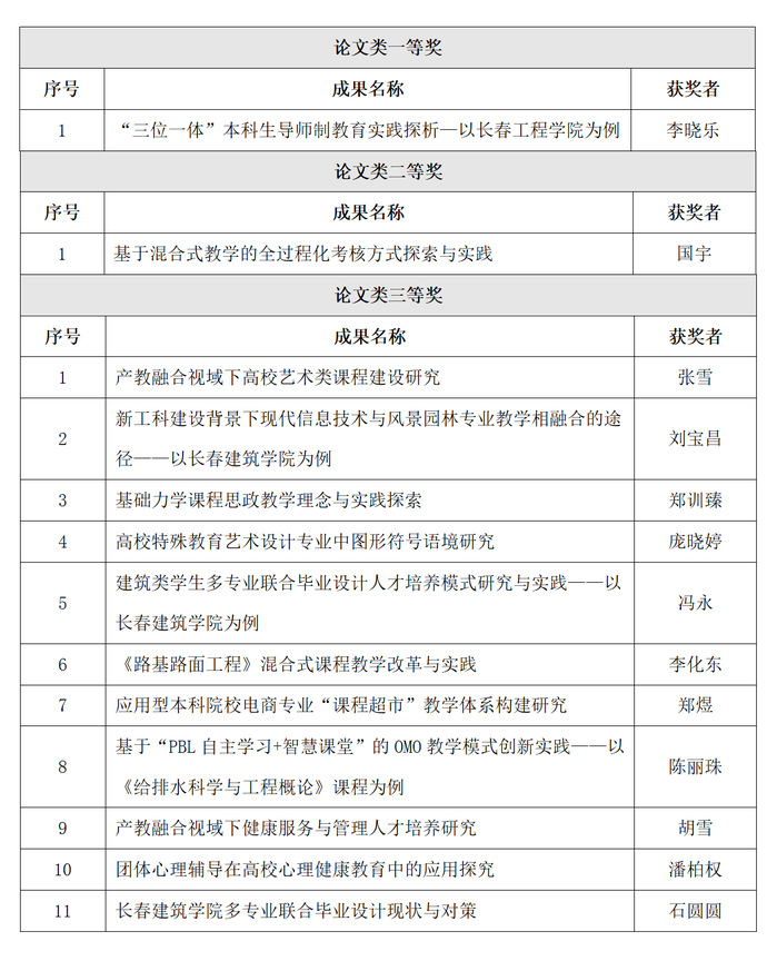 吉林省高等教育学会第十七届优秀高教科研成果评奖工作已于近日结束。经个人申报、各学院推荐、高等教育研究中心审核、学校严格把关、吉林省高等教育学会专家组多轮评审、吉林省高等教育学会审批,学校13项成果获奖,其中,论文类一等奖1项、二等奖1项,三等奖11项。