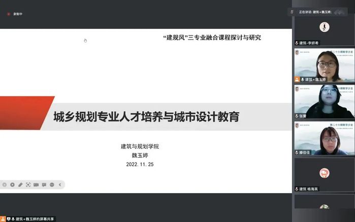 11月25日下午,建筑与规划学院开展了“建规风”——三专业融合课程探讨与研究沙龙活动,学校教师教学发展处、相关教学单位教师参与了交流学习。活动由建筑与规划学院副院长张蕾主持,城乡规划教研室主任魏玉婷、城乡规划专业带头人杨海英及建筑学教研室主任滕佳佳作主题分享。本次活动以城市设计为主要切入点,梳理了在国家政策及学科体系变化的大背景之下建筑学、城乡规划及风景园林三专业的融合模式,即在教学中“优化教学内容、混合创新教学、重视实践训练”,提升学生能力素质;在实践中以问题为导向,强调多专业、多主体参与模式,进一步推动建筑与规划学院的学科建设发展。