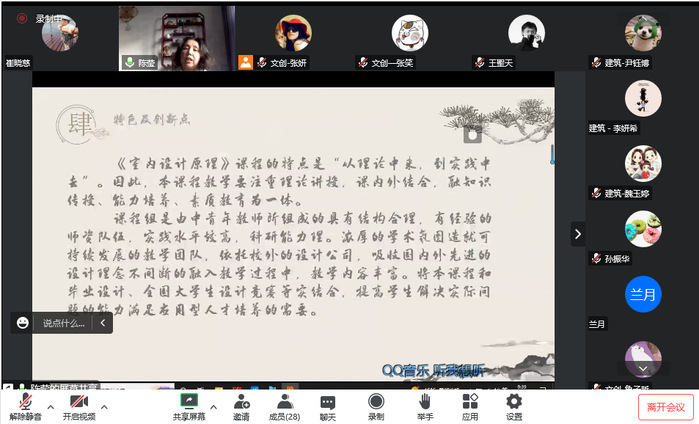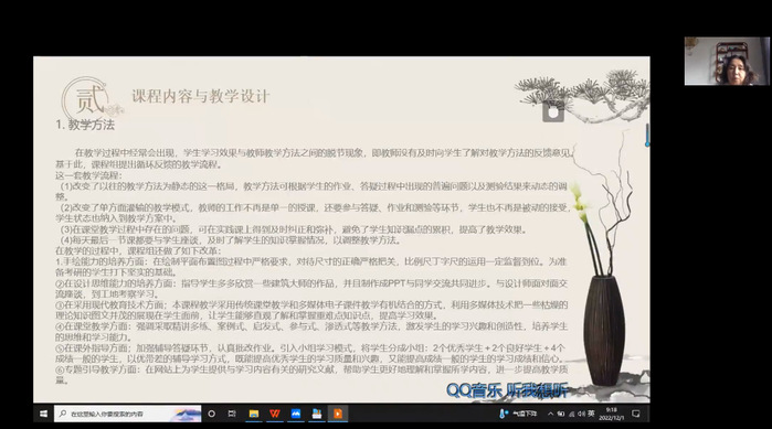 陈教授结合多年的教学经验分享了课程建设的思路和方法,她从课程基本情况和课程团队、课程内容与教学设计、教学管理、教学效果课程特色与课程水平四方面介绍了艺术设计课程建设,在课程功能方面进行了全新的定位。同时采用了传统课堂教学、多媒体电子课件和网络资源相结合的教学方法,实现课堂效果事半功倍。陈教授鉴于当下网络教学的现状总结了现存问题,并提出了今后教师应该努力的方向。