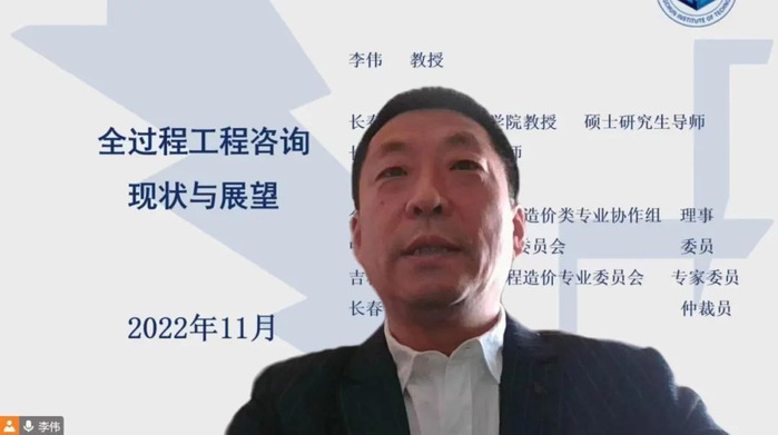 李伟教授长期从事工程造价管理、建筑经济领域研究。在投资与工程造价、建筑经济、工程项目信息化管理等方面取得了丰硕的教学和科研成果。主持完成省、部级科研项目10余项,获吉林省自然科学学术成果奖1项。他结合自己的科研实际指出,实行全过程工程咨询,其高度整合的服务内容在节约投资成本的同时,也有助于缩短项目工期提高服务质量和项目品质有效地规避了风险这既是政策的导向,也是行业进步的体现。他还为同学们解读了全过程咨询的优势:一是节约投资成本;二是有效缩短工期;三是提高服务质量;四是有效规避风险;五是提高企业管理水平。
