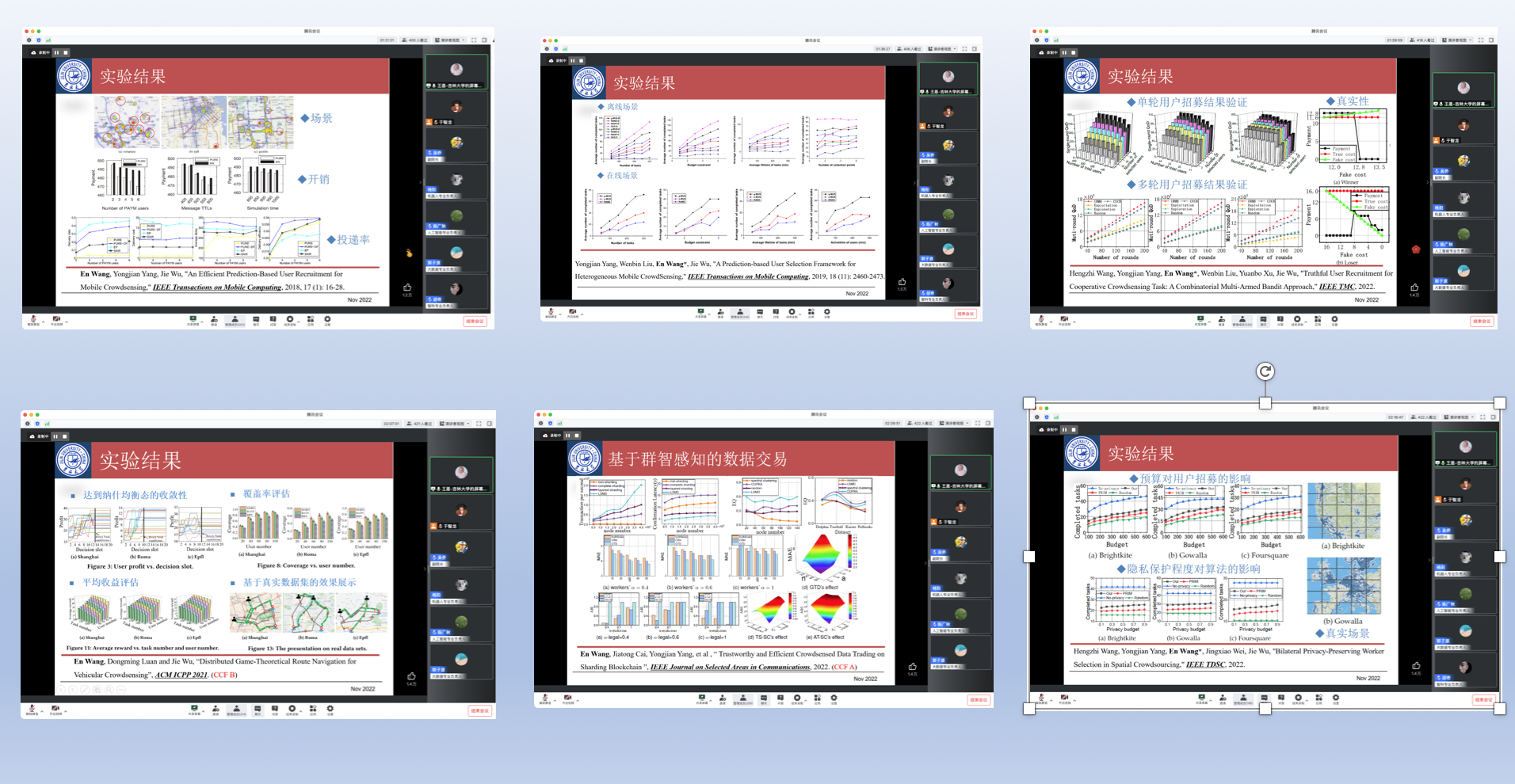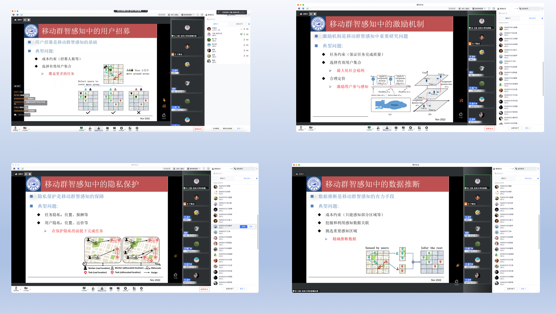 王恩教授现为吉林大学计算机科学与技术学院博士研究生导师,吉林省拔尖创新人才、入选省青年人才托举计划。他在讨论到移动群智感知在发展中面临的问题时着重介绍说,移动群智感知能够提供数据与服务的基础是移动用户,其在移动性、感知能力、招募场景、到来顺序等多个方面有着个性化的复杂特性。而面对如上特性,在实际应用中,应该如何选择适合的用户来完成感知任务,仍是亟待解决的关键问题。为此他从用户招募策略、激励机制、隐私保护策略、数据推断方法等方面逐一提出问题并予以剖析。针对自己团队近期研究成果,同时结合实验结果,向老师和同学们深入讲解了对于各类策略、机制等方面的具体实现方式和创新之处。