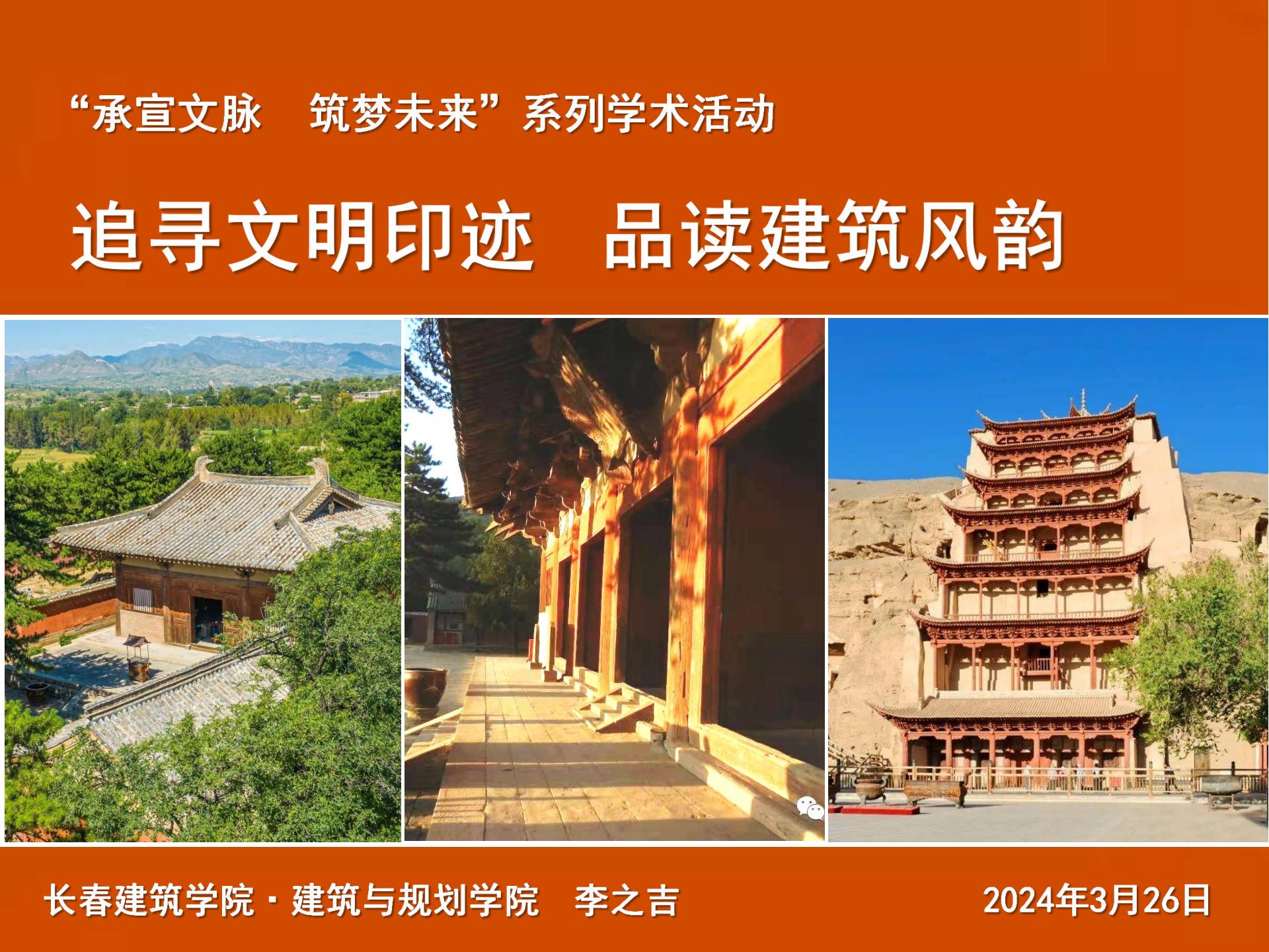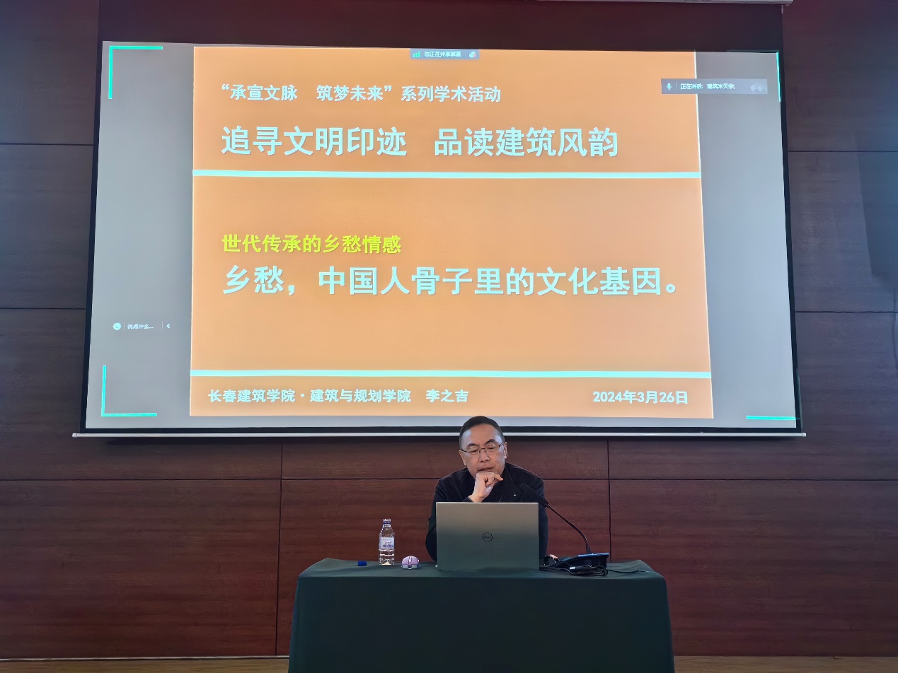 3月26日下午,建筑与规划学院邀请名誉院长、教育总监、吉林省教学名师李之吉教授在国际学术报告厅主讲“追寻文明印迹 品读建筑风韵”为主题的专题讲座。滕佳佳副院长主持了讲座,全院师生线上线下同步参加了讲座。
