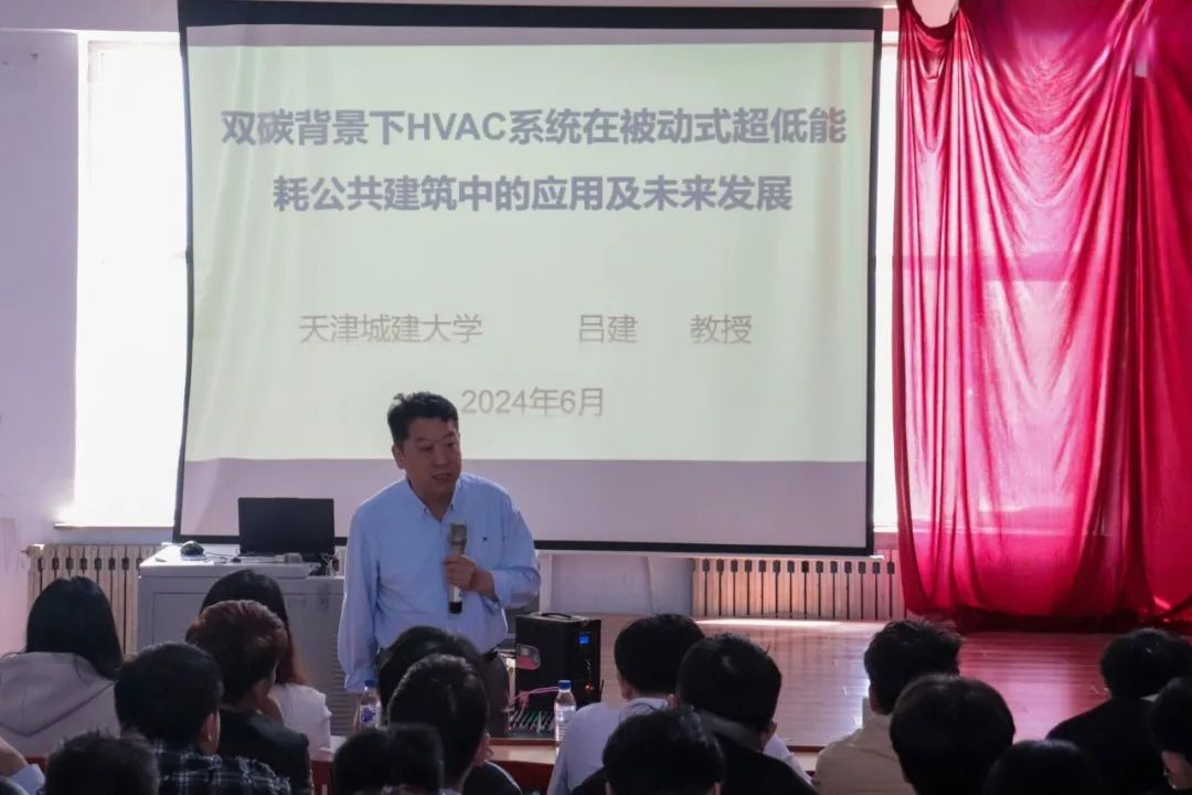 6月3日上午,城建学院在城建报告厅举办了“HVAC系统在被动式超低能耗公共建筑中的应用及未来发展”学术讲座。讲座特邀天津城建大学吕建教授主讲,城建学院院长刘晔、建筑环境与能源应用工程专业全体教师及2021级、2022级同学参了讲座。讲座由建环专业教研室主任兼实验中心主任安笑媛老师主持。